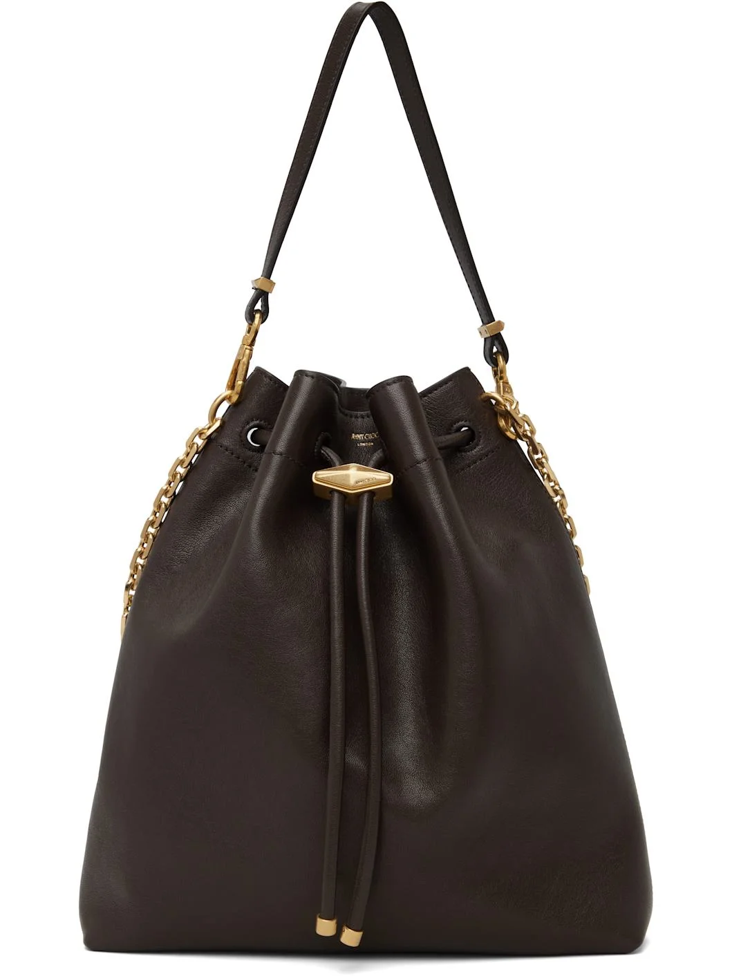 Grained sheepskin shoulder bag. · Detachable carry handle · Detachable cable chain shoulder strap · Logo stamp at face · Cord-lock drawstring closure · Zip pocket at interior · Microsuede lining · Logo-engraved gold-tone hardware · H13" x W12" x D3" Supplier color: Chocolate/Gold Sheepskin. Made in Italy 252528F048000