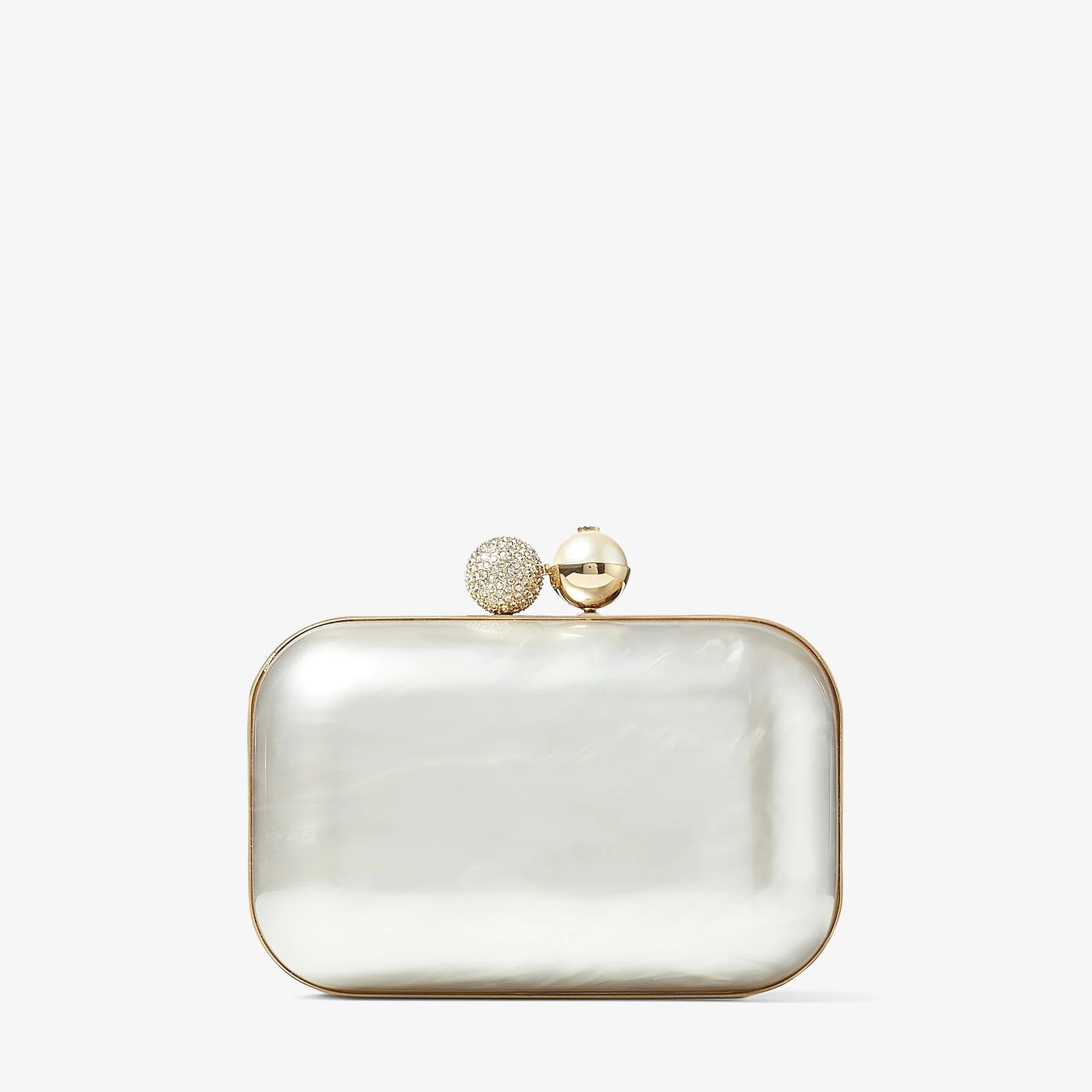 Details, Care & Fit Item No. CLOUDTLY Our Cloud clutch is a glamorous piece in ivory Mother of Pearl. Cleverly crafted to fit naturally in your hand, this compact minaudiere is exquisitely structured with a detachable chain strap and features a spacious interior for all of your day or night essentials. A timeless piece, complemented with a ball clasp decorated with pearls and crystals. - Mother of Pearl - Pearl and crystal clasp - Detachable chain strap - Bag measures: L 15 x H12 x W6 cm - Made in Italy