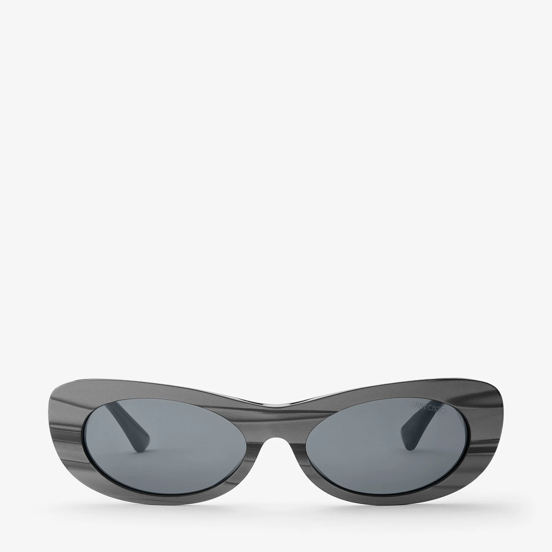 Details, Care & Fit Danny is a modern oval silhouette designed with a thick frame. They feature dark grey shaded lenses and are complemented by a crystal-embellished Jimmy Choo monogram on the temple. - Acetate - Bio-nylon lenses - Dark grey shaded lenses - Oval frame - Crystal JC monogram - 100% UVA and UVB protection - Presented with a Jimmy Choo case and cleaning pouch - Lens width: 5.4cm - Bridge length: 1.7cm - Temple length: 14cm - Made in Italy