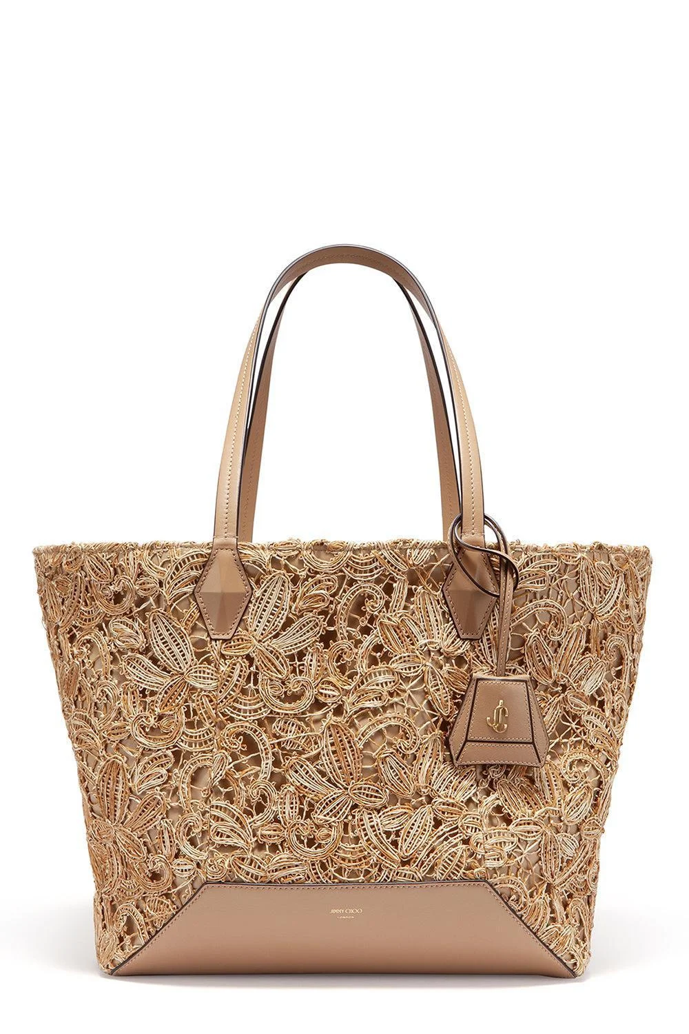DETAILS AND INSIGHT Jimmy Choo diamond leather lace tote in latte/gold. Perforated Leather L 26-53 (Adjustable) X H 28 X W 14Cm Fits Iphone 17 Pro Max Made In Italy Style J000179952-00261