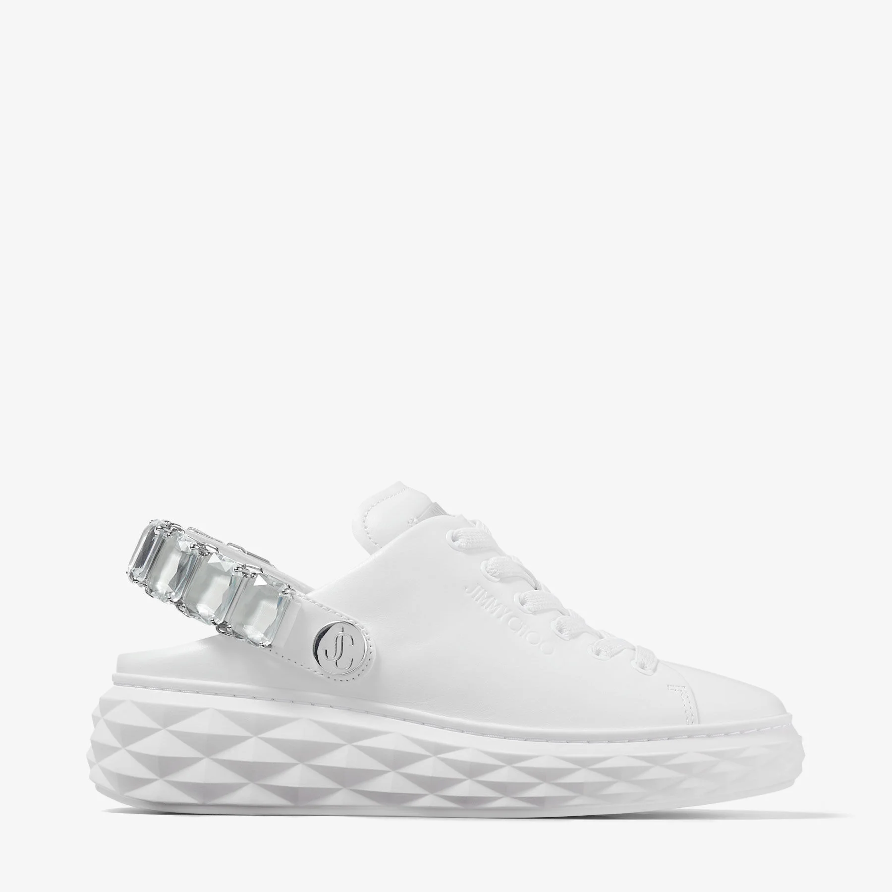 Details, Care & Fit Item No. DIAMONDMAXICRYSTALNDL Crafted from luxe Nappa leather, the Diamond Maxi has evolved in the form of a versatile slipper silhouette, with a crystal-embellished strap. Its sole is unique - moulded to our signature multi-faceted Diamond motif, composed of three parts for added durability. With exaggerated sculptural proportions, this futuristic design encases and elevates the trainer to give added height. A mix of materials, including light and flexible PU, form the core; giving it effortless flexibility. These versatile trainers are a perfect blend of innovation, style, and comfort, bringing a unique edge to your off-duty wardrobe. - Nappa leather - Crystal embellished strap - Open back - Diamond rubber sole - Rubber outsole - EVA innersole - Round toe - Jimmy Choo emblem - By purchasing this product, you are supporting sustainable leather manufacturing through the Leather Working Group