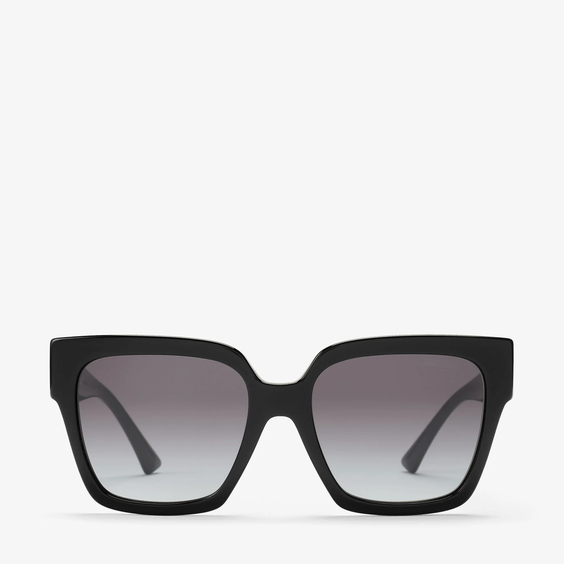 Details, Care & Fit The Eli sunglasses feature oversized square frames in glossy black acetate, balanced by soft gradient grey lenses for a refined finish. The wide temples are subtly adorned with the Jimmy Choo logo, complete with crystal-embellished O's. - Havana Acetate containing 27% recycled content - Bio-nylon lenses - Gradient grey shaded lenses - Square frame - Jimmy Choo logo - Crystal-embellished details - 100% UVA and UVB protection - Presented with a Jimmy Choo case and cleaning pouch - Lens width: 5.38cm - Bridge length: 1.7cm - Temple length: 14cm - Made in Italy