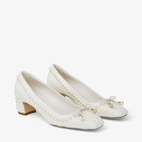 Details, Care & Fit The Elme is a classic ballerina silhouette elevated by an ultra-wearable low heel. Crafted from pearl-embellished satin, they are complemented by a pearl and crystal-adorned bow. - Satin - All-over pearls - Pearl and crystal-embellished bow - Jimmy Choo emblem - Leather lining and sole - Heel height measures: 45mm/1.7 inches - Made in Italy