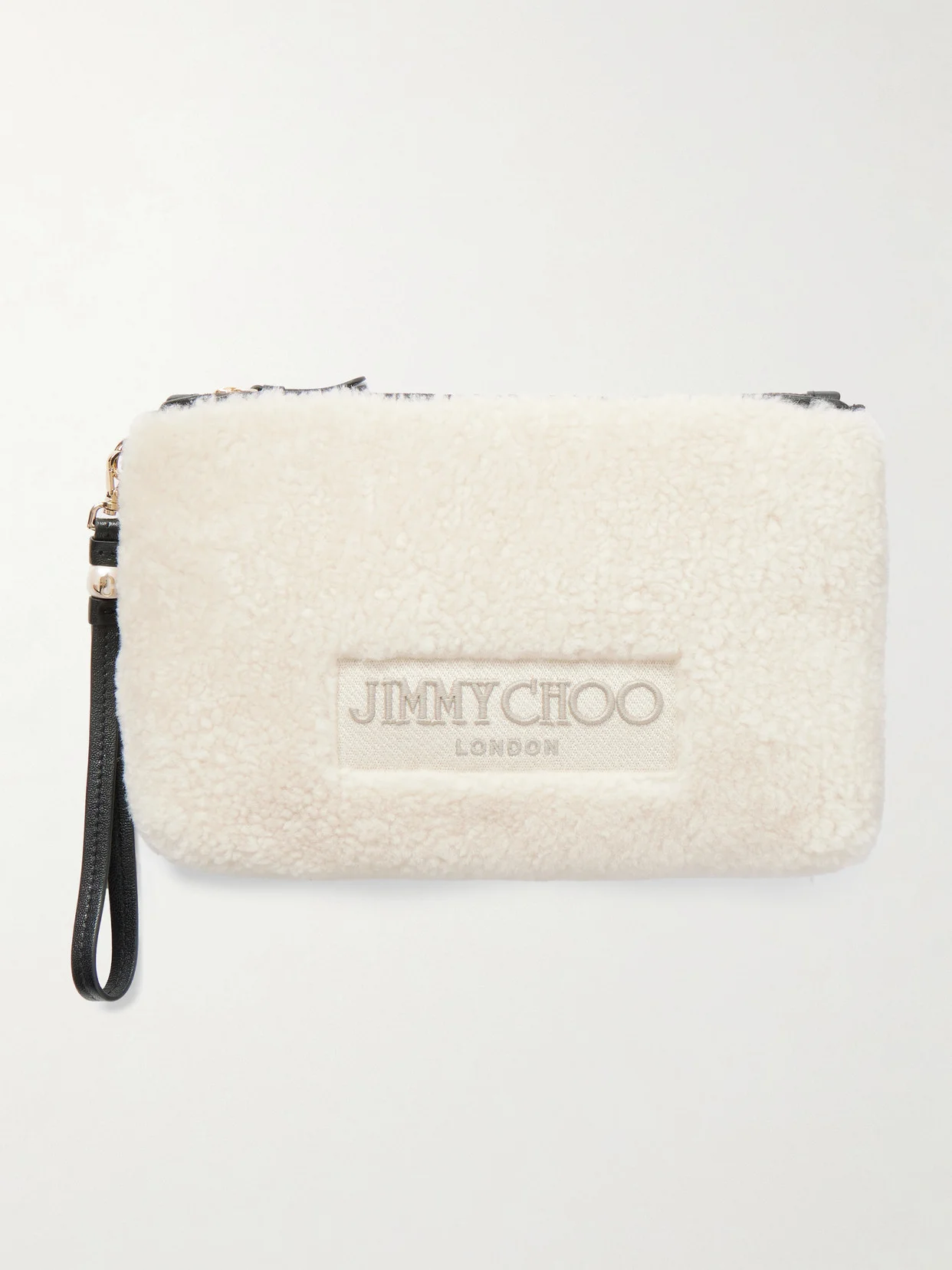 Jimmy Choo's clutch has been made in Italy from plush shearling with black leather trims to outline the shape. Embroidered with a tonal logo, it has a detachable faux pearl-embellished wrist strap and a slim interior that'll hold your phone, cards and lip balm.