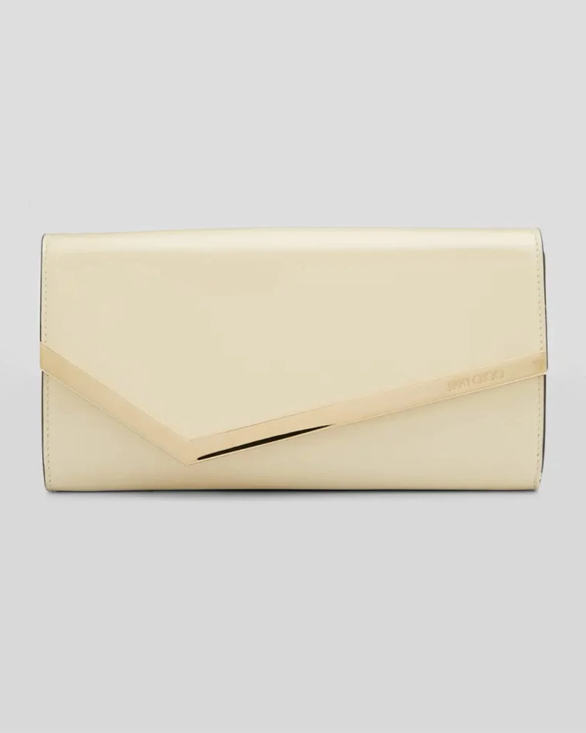 Jimmy Choo "Emmie" clutch bag in patent calf leather and lambskin leather Chain shoulder strap, 23.6" drop Can be worn as a clutch or shoulder bag Flap top with magnetic closure; metal hardware accent Interior, six card slots and one zip pocket Approx. 4.7"H x 8.7"W x 1.2"D Made in Italy