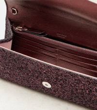 Jimmy Choo’s creations are where craftsmanship meets refined elegance for a statement-making finish. The Emmie clutch is made in Italy to an asymmetrical envelope silhouette with shimmering glitter embellishments. Product Details - Material: fabric - Lining: fabric - Made in Italy - Designer color name: Deep Merlot/Silver - Item color: burgundy - Hardware color: silver - Detachable chain shoulder strap - Internal details: Card slots, internal zipped pouch, internal slot pocket - Closure: magnetic fastening - Includes: dust bag, box - Item number: P01086413 Size & Fit - Height 11,5cm-4.5" - Width 22cm-8.5" - Depth 3cm-1" - Chain length 128cm-50.5"