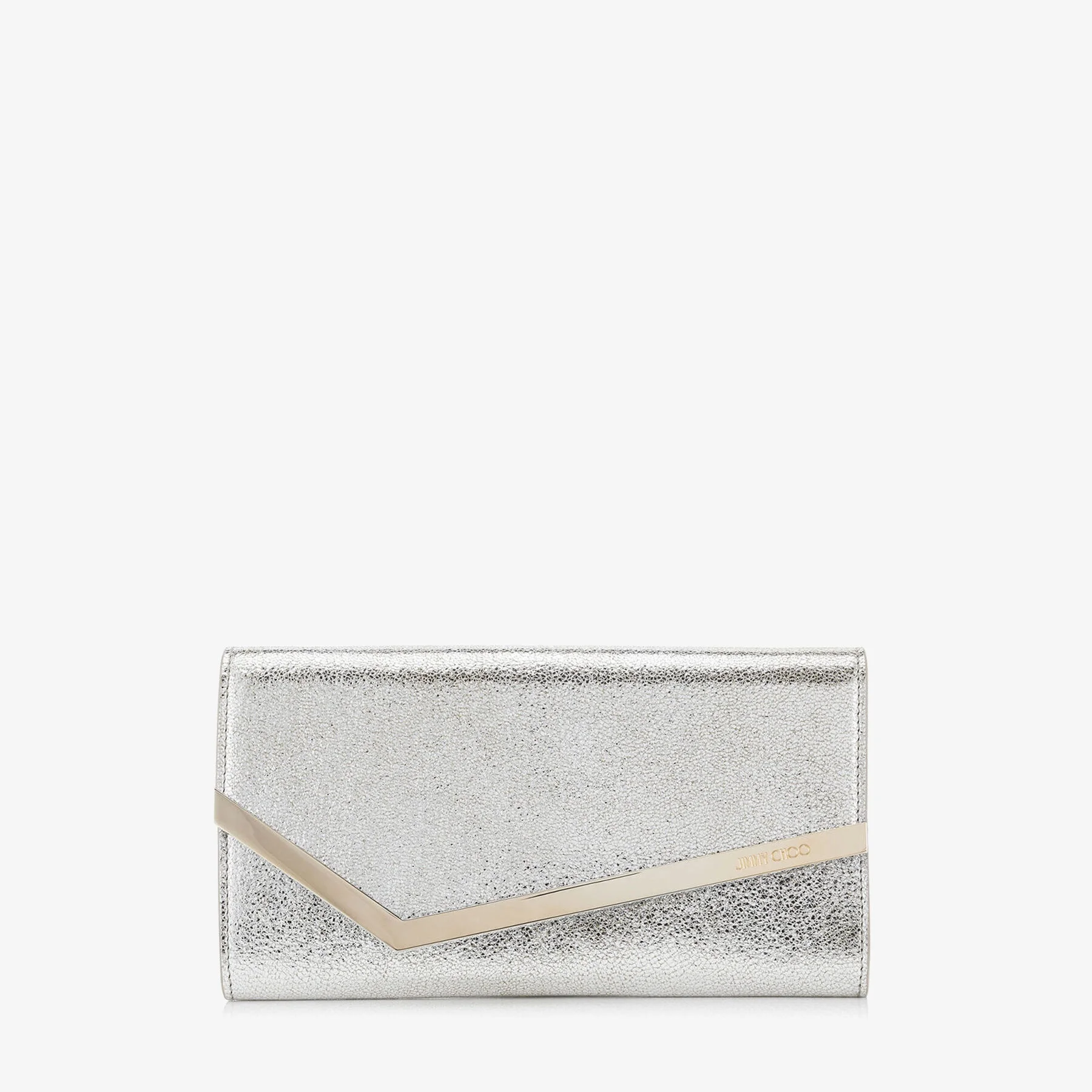 Details, Care & Fit The Emmie clutch bag in champagne glitter leather has a clean and modern raw edge construction. Designed in Italy, this ultimate evening clutch boasts a Jimmy Choo engraved magnetic snap button closure on the front panel. The detachable chain adds freedom and versatility, so wear yours full length or carried in hand. - Glitter leather - Magnetic snap closure - Detachable chain - 6 cardholders - internal zipped pocket - 1 compartment - Measures: L22 x H12 x W3cm - Max strap drop measures: 62cm - Made in Italy