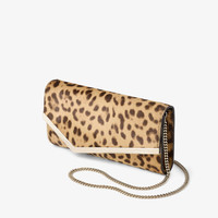 Details, Care & Fit The Emmie clutch bag in leopard print pony has a clean and modern construction. This streamlined evening clutch features a Jimmy Choo engraved magnetic snap button closure on the front panel. The detachable chain adds versatility, so wear yours full length or carried in hand. - Calf hair - Gold-tone hardware - Magnetic snap closure - Detachable chain strap - 6 card holders - Internal zipped pocket - 1 compartment - Leather lining - Bag measures: L 22 x H 12 x W 3cm - Shoulder strap drop: 60cm - Made in Italy