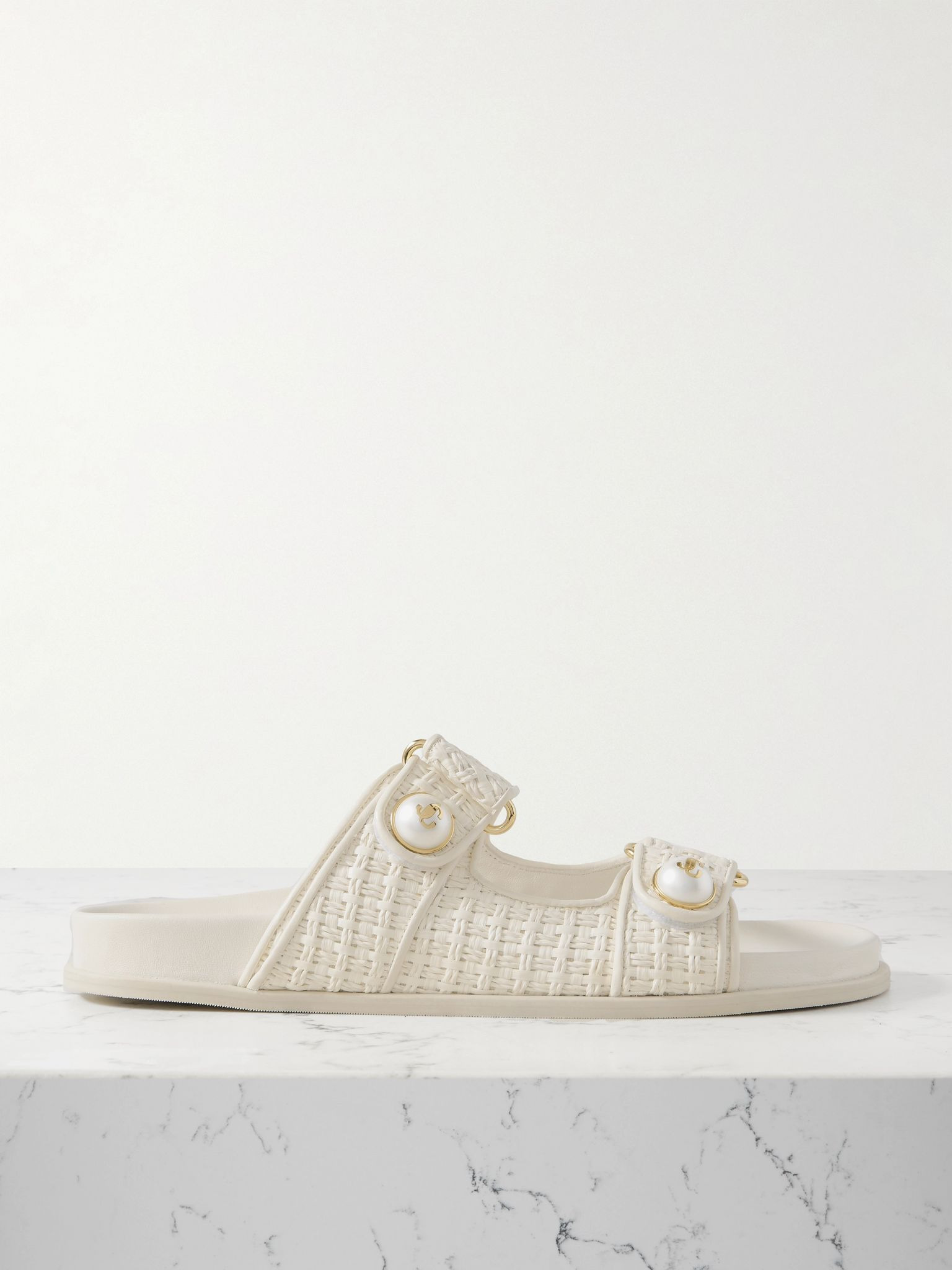 Jimmy Choo's 'Fayence' slides are the type that you can slip on with any summer outfit. They're made from raffia with adjustable straps and contoured footbeds. Look closely to notice the signature gold logo on the faux pearl embellishments. Size & Fit - Fits true to size, take your normal size - Italian sizing Details & Care - Sole measures approximately 25mm/ 1 inch - White raffia - Slip on - Designer color: Latte