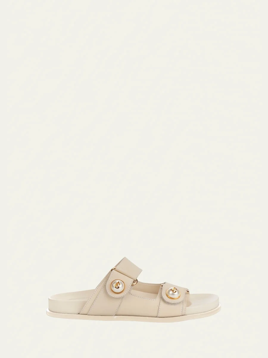 Jimmy Choo "Fayence" leather sporty slide sandals with pearly button accents Flat heel Open toe Adjustable dual strap upper Molded comfort footbed Rubber outsole Lining: Leather Made in Spain