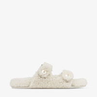 Details, Care & Fit The Fayence sandal is reimagined in curly shearling and complemented by our signature JC monogrammed pearl button detail. They feature double strap fastening with a moulded insole and rubber sole. - Curly shearling - JC monogram pearl button - Velcro straps - Moulded insole - Rubber sole