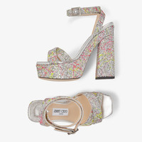 Details, Care & Fit Item No. GAIA140AKW Elevate the everyday with our Gaia platform sandals. Crafted in glitter fabric, this statement style is set on a 140mm block heel, and feature straps that cross over the toes with an ankle strap fastening. Italian sizing. Fits true to size. - Glitter fabric - Square open toe - Ankle strap with buckle fastening - Heel height measures: 140mm/5.5 inches
