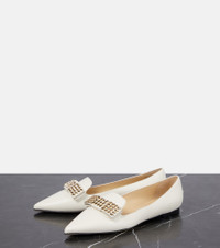 The Gala ballet flats from Jimmy Choo will instantly elevate your daily edit. The pointed-toe style is crafted in Italy from white leather and adorned with a bow and gold-toned diamond-shaped spikes. Product Details - Sole: leather insole and sole - Toe shape: pointed toe - Upper: leather - Comes with a box - Designer color name: Latte/Gold - Made in Italy - Comes with dust bag - Item number: P00818742 Size & Fit - Fits slightly large to size - we recommend trying a half size smaller - European sizes