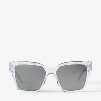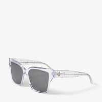 Details, Care & Fit Giava is a contemporary pillow-shaped style accented with tonal glitter effect. It is designed with glitter at the top of the rim and at the temples, complemented by our signature emblem. - Recycled acetate - Bio-nylon grey silver mirror lenses - Square frame - Glitter finish - 100% UVA and UVB protection - Presented with a Jimmy Choo case and cleaning pouch - Lens width: 5.5cm - Bridge length: 1.6cm - Temple length: 14cm - Made in Italy - This product is made with recycled acetate, which is obtained through carbon renewal technology - Bio-nylon lenses are made with a percentage of bio-based carbon from plant-based sources