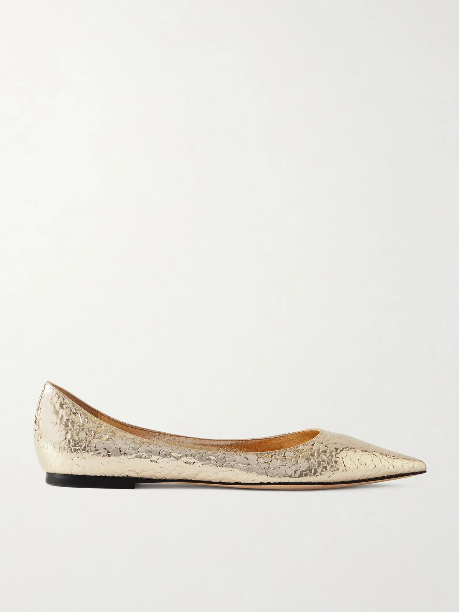 Jimmy Choo’s 'Love' ballet flats are crafted from metallic cracked-leather that shimmers beautifully with every step. They have leather linings and slight heels. Wear yours to bring a touch of glamour to evening outfits. Size & Fit - Fits true to size, take your normal size - Italian sizing Details & Care - Material: fabric, calf leather, goat leather - Sole: leather insole and sole - Made in Italy - Colour: gold
