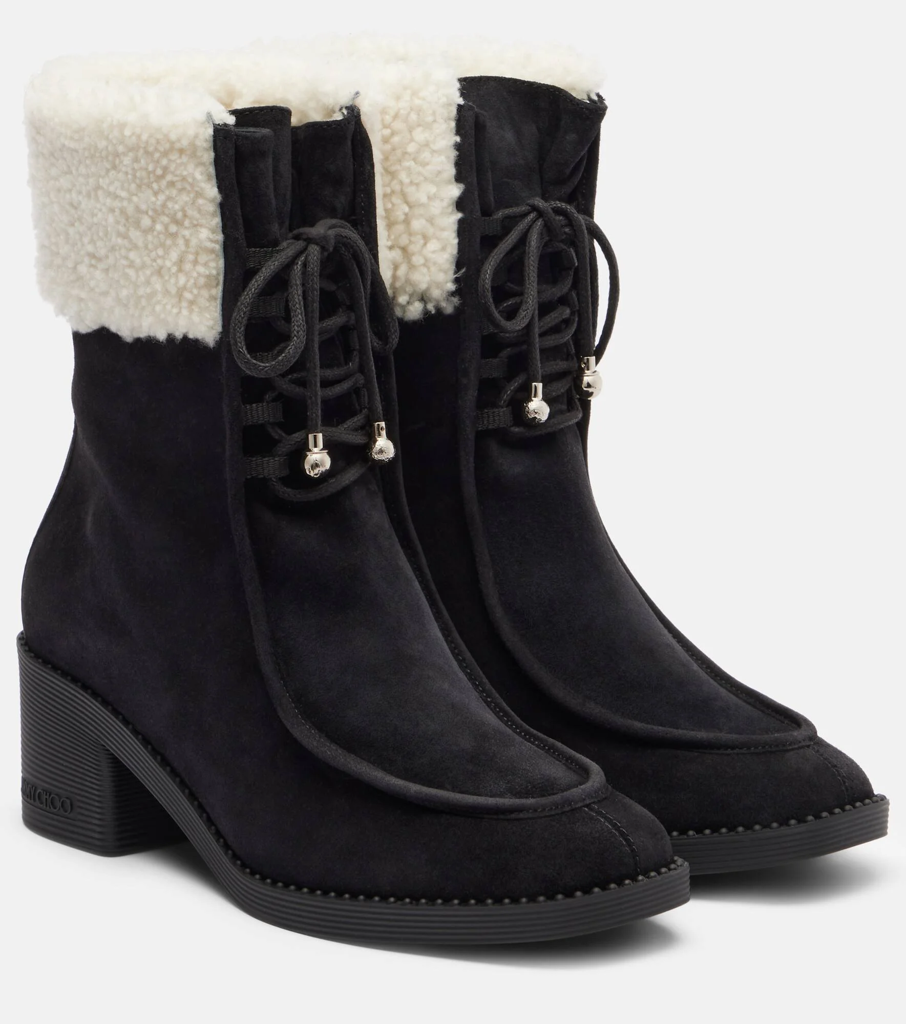 The Hali ankle boots from Jimmy Choo are expertly crafted in Italy from smooth suede and finished with a shearling trim along the shaft. This pair features a square-toe silhouette, 60mm block heels, and a lace-up closure. Product Details - Upper: leather (suede) - Lining: shearling - Sole: leather insole, rubber sole - Toe shape: square toe - Made in Italy - Includes: dust bag, shoe box - Designer color name: Black/Natural - Item color: black, white - Trim: shearling - Hardware color: silver - Closure: lace-up - Item number: P01109744 Size & Fit - True to size - Slightly narrow at the back - European sizes - 6cm-2.5" heel (size EU 38) - 2cm-1" platform (size EU 38)