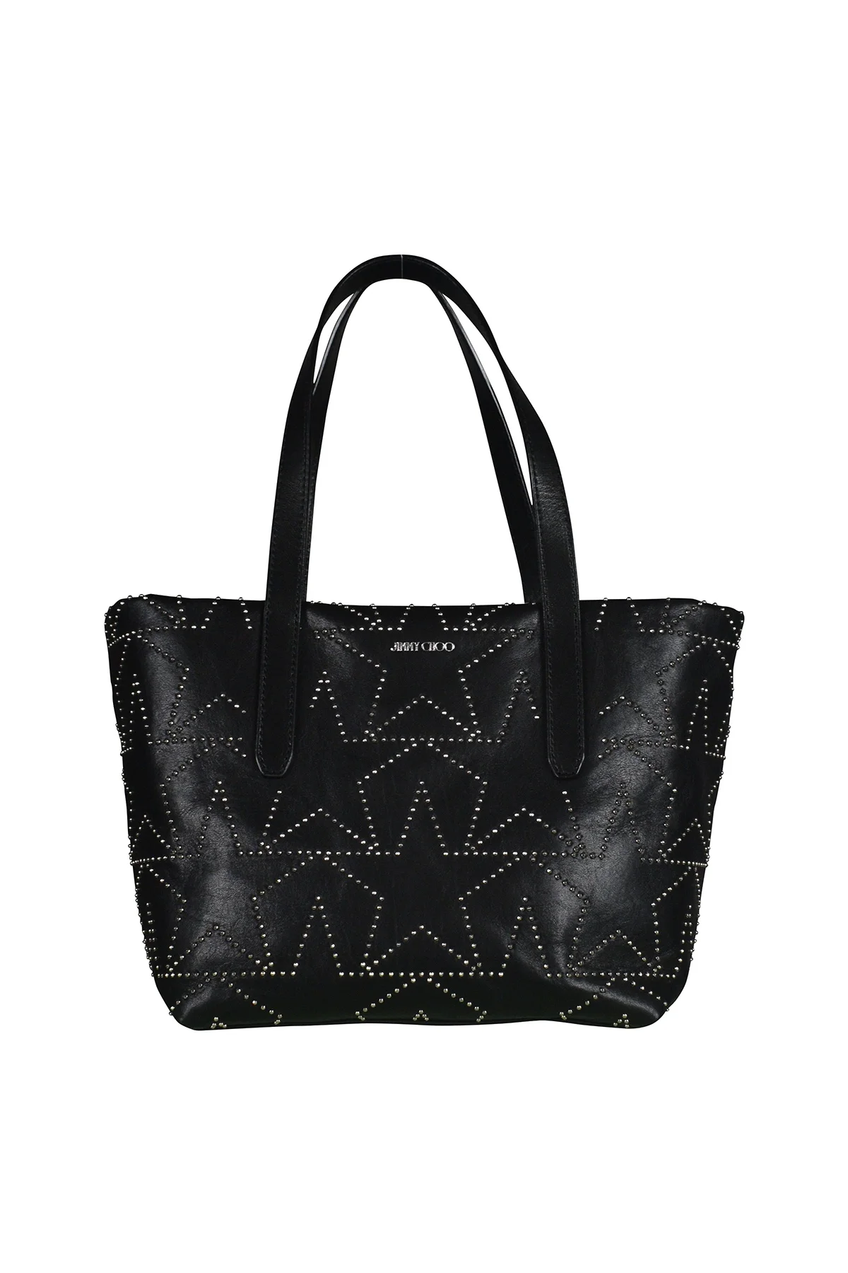 Jimmy Choo handbag in black leather with rhinestone stars. Jimmy Choo emblem on the front. A spacious compartment. A small integrated pocket. Two handles. 100% leather. Dimensions : 13x20x25cm. Made in Italy.
