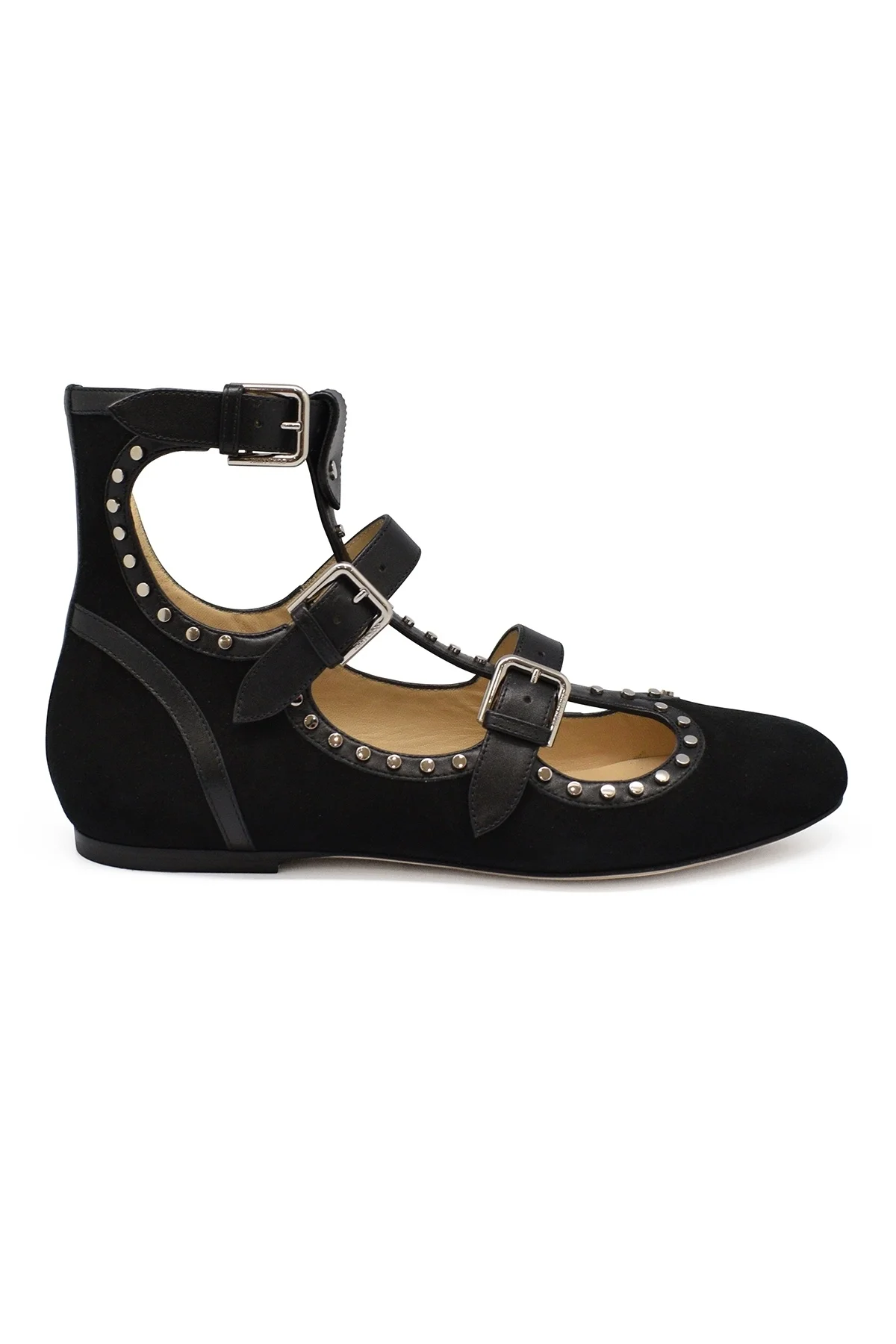 Jimmy Choo Hartley ballet flats in black suede and leather with studs. Triple buckle. Leather sole. Made in Italy.