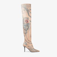 Details, Care & Fit Item No. JCXJPGOTKLVO A distinctive design created in collaboration with Jean Paul Gaultier; this over the knee boot is both daring and sophisticated. Crafted in buttery calf leather, decorated with exclusive Jimmy Choo / Jean Paul Gaultier tattoo artwork – an original hand-drawn design inspired by the Jean Paul Gaultier archive. The boots are beautifully fitted to the leg without being skin tight, ensuring a flattering silhouette. Closed with an internal zip, they’re constructed with a chiselled stiletto heel complemented by a lacquered sole with a digitally printed logo featuring both brands. Italian sizing. Fits true to size. - Calf leather - Hand drawn tattoo print inspired by the Jean Paul Gaultier archive - Pointed toe - Stiletto heel - Internal zip - Lacquered sole - Digitally printed branded sole - Heel height measures: 90mm/3.5 inches - Made in Italy - We advise that you keep the film on the soles when trying any pairs on, and only remove once you have decided to keep your purchase