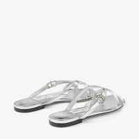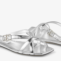 Details, Care & Fit Item No. JESSFLATQUI Characterised by a sleek silhouette and architectural lines, the Jess flat is crafted from a striking liquid metal leather. A contemporary square toe, lends a modern look to this sandal that will instantly elevated looks in your off-duty and weekend wardrobe. - Liquid metal leather - Square toe - Jimmy Choo emblem - Leather lining and sole - Made in Italy - By purchasing this product, you are supporting sustainable leather manufacturing through the Leather Working Group