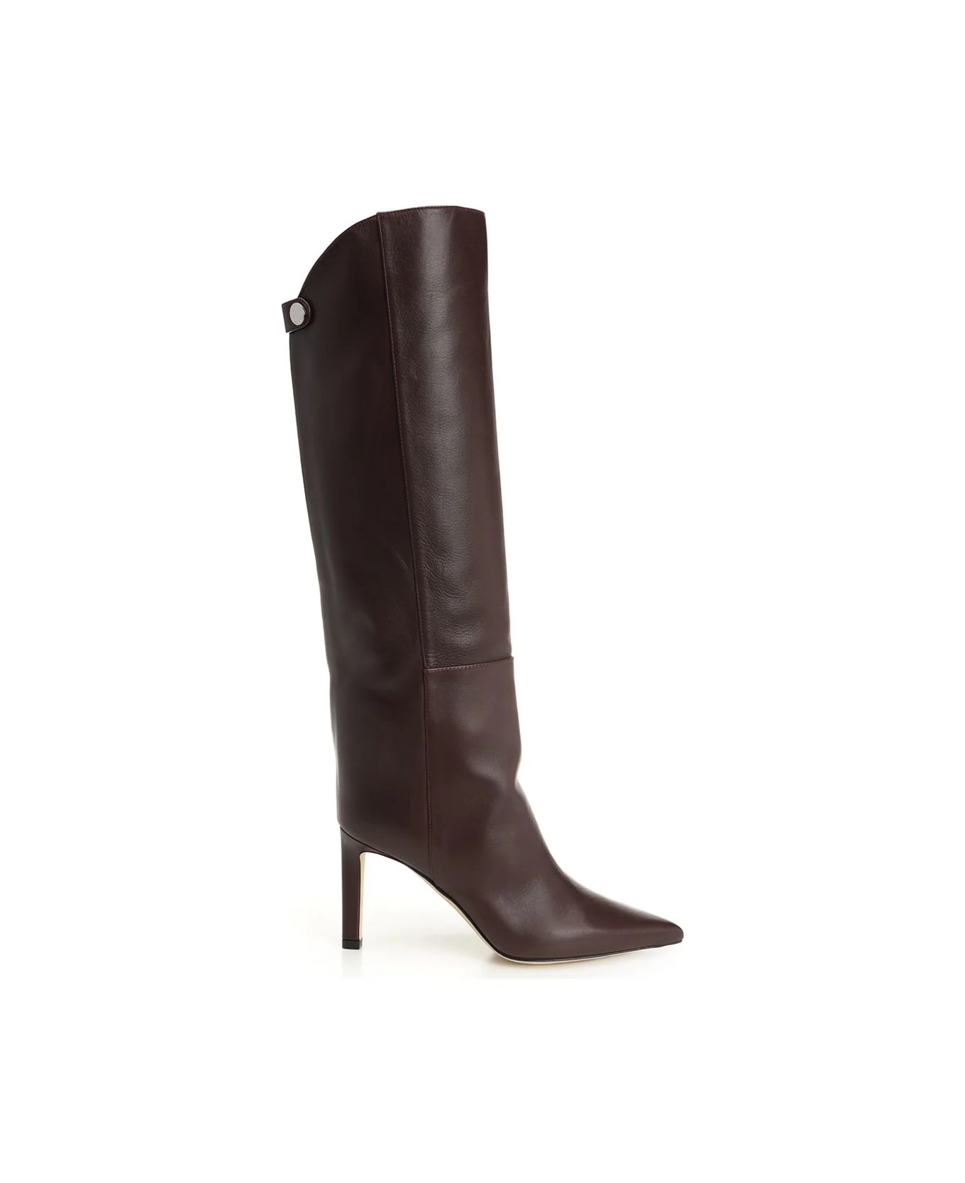 Jimmy Choo 'Alize' knee-high boot in smooth leather, pointed toe, with a thin stiletto heel and a strap fastening. Composition: 95% GOAT 5% LAMB (India (for skins only);Capra Hircus Hircus;Farm) Composition: 100 Af Made in: Italy Color: Burgundy Size and fit: - T.85 mm Model number: ALIZZEKB85SQMDEEP
