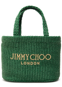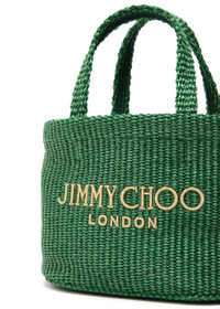 Info & Care Jimmy Choo woven raffia tote; Two top handles, detachable leather shoulder strap, logo embroidery Open top; Size & Fit Width: 9 inches/ 23cm Height: 6.75 inches/ 17cm Depth: 4.25 inches/ 11cm Top handle drop: 4.5 inches/ 11.5cm Shoulder strap drop: 21 inches/ 53.5cm