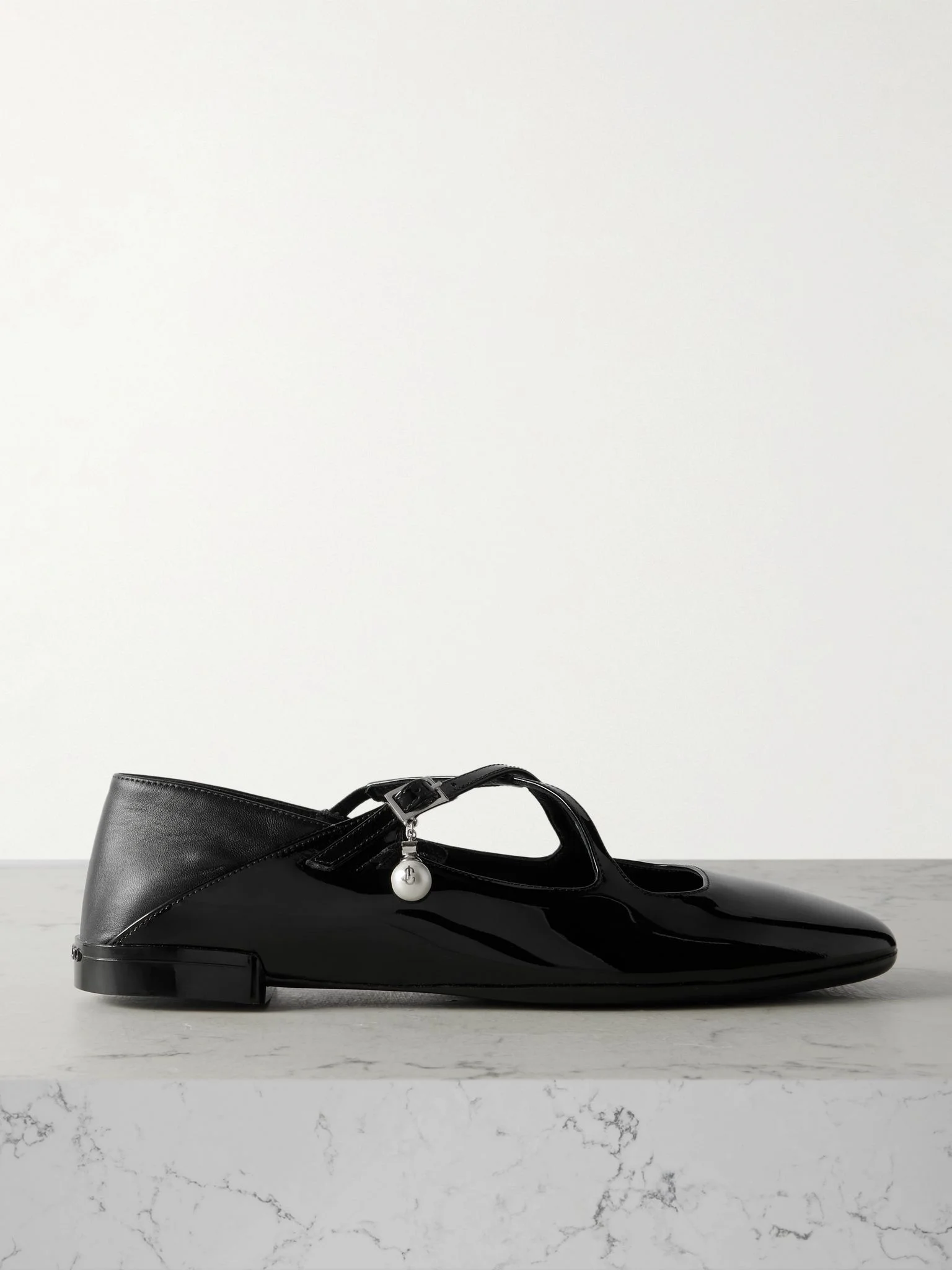Jimmy Choo's collapsible-heel 'Eleri' flats are an elegant cross between ballet shoes and Mary Janes. They've been made in Italy from glossy patent-leather and embellished with logo-detailed faux pearl charms at the crossover straps. Wear yours with mini dresses or jeans. Details & Care - Slight heel - Black patent and matte leather (Calf) - Buckle-fastening strap