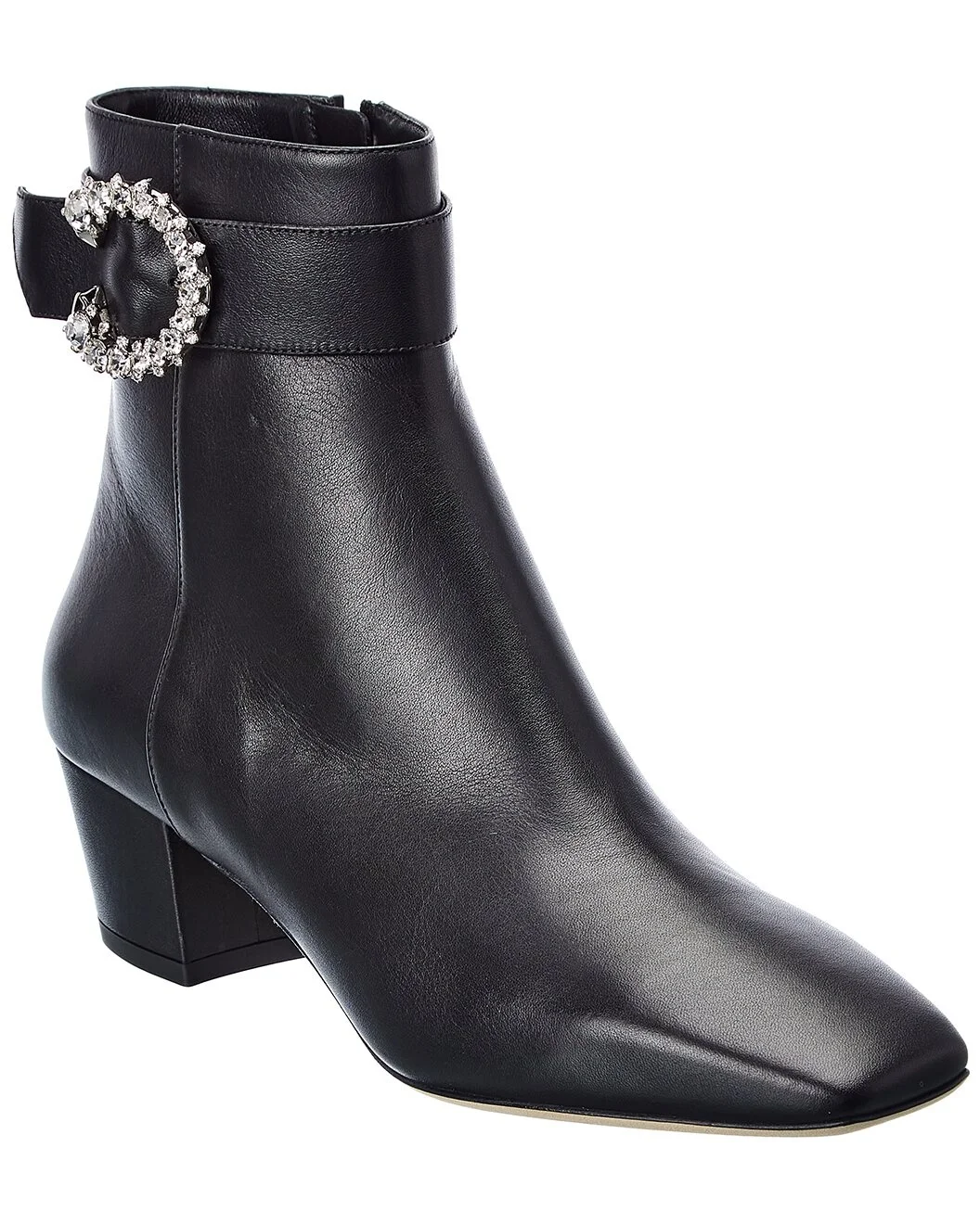 - About the brand: Born in London in the early 90's, Jimmy Choo was one of the first luxury brands to bring shoes and handbags to the red carpet. A playful sense of glamour and exceptional Italian craftsmanship separate Jimmy Choo from the rest, in Hollywood and beyond. - Please note: Size selections are European. For US conversions, please reference size chart. - Based on feedback from Members, this brand typically runs small. We suggest sizing up a half size for most styles. - Made in Italy - Myan 45 Leather Boot in black leather and silver-tone hardware with crystal embellished buckle - Inner side zip-up closure - Lightly padded leather insole - Smooth leather sole - 2in heel - 6in shaft - 10.5in boot circumference - Please note: All measurements are approximate and were taken from a size 37; slight variations may occur. - Our products are 100% genuine. In some cases we purchase merchandise from trusted independent suppliers and not directly from the brand owner. In all cases we stand by the authenticity of every product sold on our site.