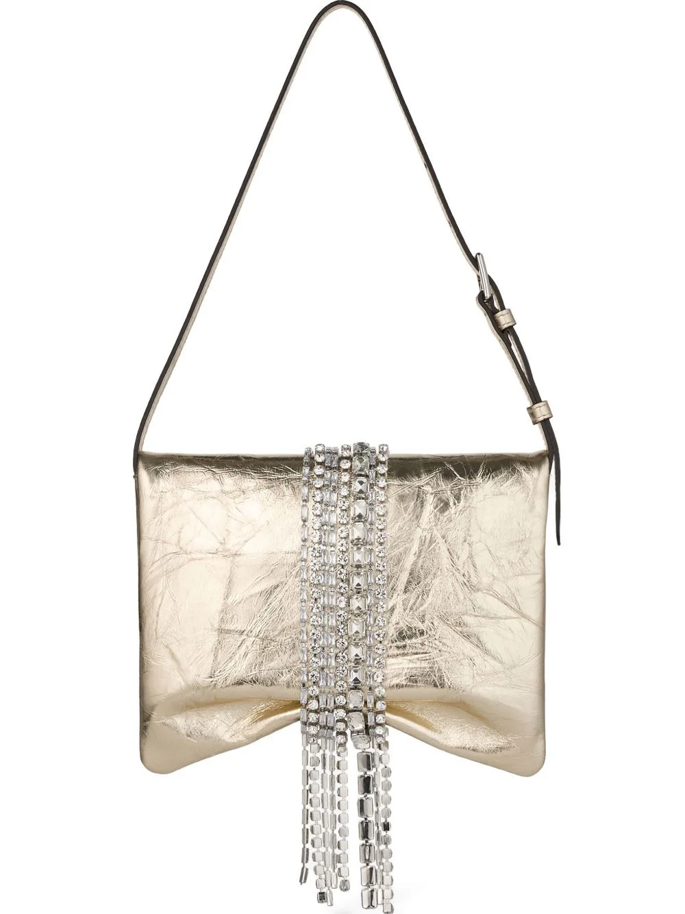 Zandra shoulder bag Highlights - Gold-tone - Foldover top with magnetic fastening - Adjustable shoulder strap - Crystal embellishment - This piece comes complete with a protective dust bag. Made in Italy Composition Outer: Metallic Leather 75%, Brass 25% SIZE & FIT Measurement DEPTH 1.57 in(4 cm) HEIGHT 6.29 in(16 cm) STRAP 8.07 in(20.5 cm) WIDTH 8.07 in(20.5 cm)