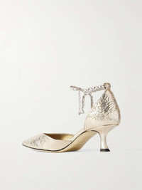 From the "crushed" metallic leather to the jewelry-inspired crystal-embellished straps, Jimmy Choo's 'Stevie' pumps are undeniably glamorous. They're set on manageable 50mm heels and have sleek pointed toes. Wear yours to evening events or when you want to add a little sparkle to casual outfits. Size & Fit - Fits true to size, take your normal size - Narrow at the toe - Italian sizing Details & Care - Heel measures approximately 50mm/ 2 inches - Gold textured-leather (Lamb) - Hook-fastening ankle strap