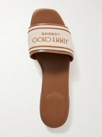 Jimmy Choo's 'Joa' slides are made from leather that's layered with canvas along the wide strap and features the logo printed at the center. Perfect for casual days in the city or on vacation, they have a slight heel and subtle cushioning. Small to size. See Size & Fit notes.