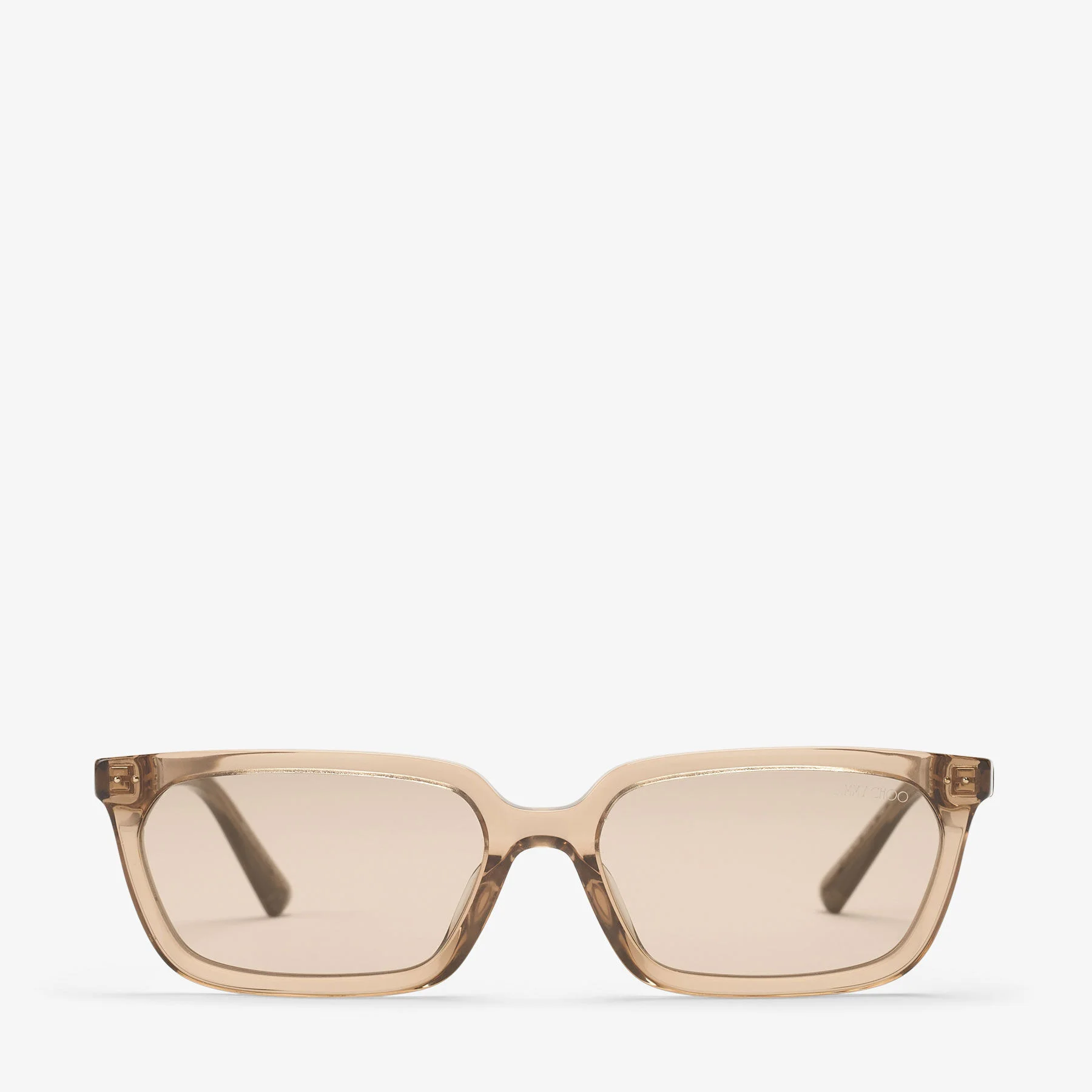 Details, Care & Fit With a rectangular shape and transparent tan finish, the Josi sunglasses are a subtle statement. Tonal lenses and slender arms keep the look sleek, while the Jimmy Choo logo adds a hint of glamour. - Acetate containing 27% recycled content - Bio-nylon lenses - Light brown shaded lenses - Rectangular frame - Jimmy Choo logo - 100% UVA and UVB protection - Presented with a Jimmy Choo case and cleaning pouch - Lens width: 5.5cm - Bridge length: 1.6cm - Temple length: 14cm - Made in Italy