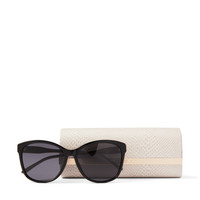 Details, Care & Fit Item No. LIDIEFSK59E1EI Our LIDIE sunglasses are presented with a subtle cat-eye shape for retro style. Crafted in Italy from black acetate, they feature grey lenses and a grey leopard print pattern along the inside of the arms. They are finished with the subtle signature rose gold JC monogram. - Black acetate front and temples - Grey leopard print on temples - Rose gold JC monogram - Lasered gold Jimmy Choo lettering on tip - Grey lenses - 100% UVA and UVB protection - Comes with Jimmy Choo case and cloth - Made in Italy