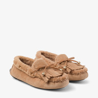 Details, Care & Fit The Manon loafer is realised in velvet suede and lined in warm, shearling for added comfort. A classic driving sole and leather lacing enhances the moccasin silhouette. This timeless style is finished with subtlly branded hardware aglets, whipstitching and Jimmy Choo embossing across the back. - Velvet suede - Shearling - Driving sole - Rounded toe - Leather laces - Branded metal hardware - Whipstitching - Made in Italy