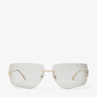 Details, Care & Fit The Margaret sunglasses make a style statement with wraparound lenses and sleek metal frames complemented by shimmering crystals and studs. They are crafted with light grey lenses to create a glittering look. A round metal plate with an embossed outline and the iconic JC emblem elegantly sits on fine metal temples. - Recycled acetate - Bio-nylon light grey lenses - Rectangular frame - Crystal embellishment - Studs - 100% UVA and UVB protection - Presented with a Jimmy Choo case and cleaning pouch - Lens width: 6.1cm - Bridge length: 1.7cm - Temple length: 14cm - Made in Italy