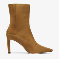 Details, Care & Fit Item No. MAVIE85SUE Sleek and sophisticated, our Mavie ankle boots are crafted in caper green suede. Made in Italy, they feature a sharp pointed toe and sit on slim 85mm heels. Wear yours to instantly elevate day or night dressing. - Suede - Pointed-toe style - Side zip fastening - Leather lined - Leather sole - JC monogram - Heel height measures: 85mm/3.3 inches - Made in Italy