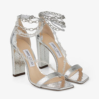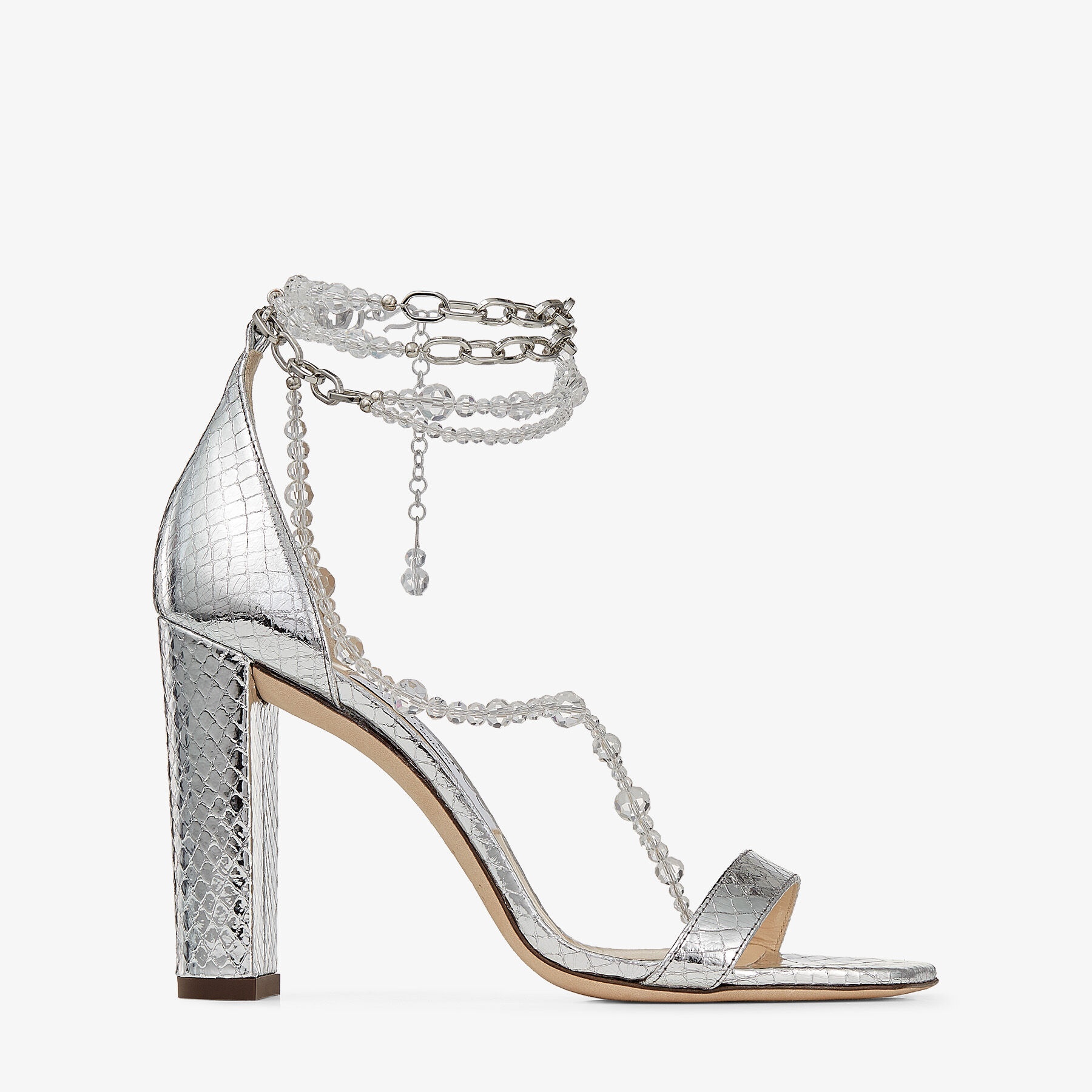 Details, Care & Fit Item No. NEENA100AFX Daring and distinct, the NEENA sandals are Italian-crafted in silver candy wrap leather. Over 200 glass beads gently drape across the foot and wrap around the ankle like jewellery. Our standout style is finished with a chain ankle strap and a modern square toe. Italian sizing. Fits true to size. - Foil-wrapped leather - Glass bead embellishment - Chain ankle strap with hook fastening - Toe strap - Square toe - Leather sole - Heel height measures: 100mm/ 4 inches - Made in Italy