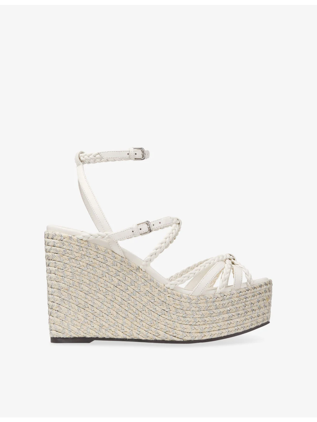 PRODUCT DETAILS - Jimmy Choo leather espadrilles - 100% leather - Buckle fastening - Open toe, multiple woven straps, espadrilles wedge heel - Specialist leather clean - Made in Italy - Heel height 3.9in - Upper: 100% leather - Lining: 100% leather - Sole: 100% rubber Ref: R04549859