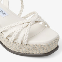 Details, Care & Fit The Nyra wedge sandal is set on a 60mm platform wrapped in metallic jute. Its intricate straps features a mix of slender and rounded braided and soft latte Nappa leather straps, elegantly interlaced for texture and support. A matching leather knot anchors the design, while the adjustable ankle strap flatters the leg and ensures a secure fit. Finished with a lightweight rubber sole for effortless all-day wear. - Nappa leather - Metallic jute platform - Braided straps - Leather knot - Adjustable ankle strap - Rubber sole - Heel height measures: 60mm / 2.3 inches - Platform height: 30mm/ 1.1 inches - Made in Spain