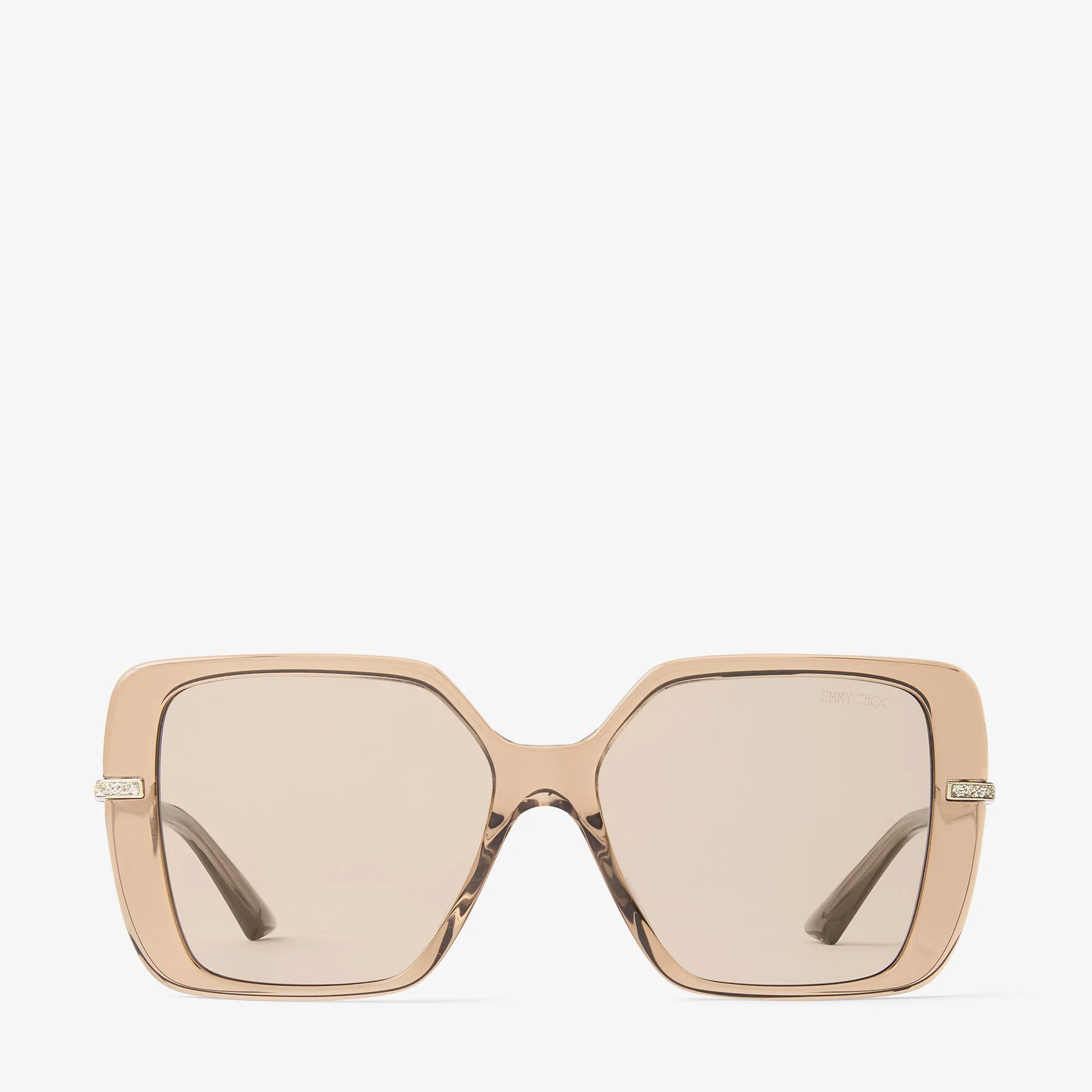 Details, Care & Fit Bold proportions meet soft tones in these oversized square sunglasses. Crafted with a transparent tan frame and glitter-detailed temples, the Pati silhouette offers modern glamour with a lightweight feel. - Acetate containing 27% recycled content - Bio-nylon lenses - Light brown shaded lenses - Square frame - Jimmy Choo logo - Glitter detail - 100% UVA and UVB protection - Presented with a Jimmy Choo case and cleaning pouch - Bridge length: 1.5cm - Temple length: 14cm - Made in Italy