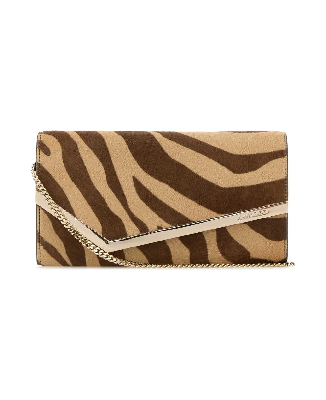 Printed Calf Hair Emmie Clutch from Jimmy Choo Made in: Italy Color: NATURALLIGHTGOLD Size and fit: - Width: 22 m Height: 12 cm Depth: 4 cm Shoulder strap length: 63 cm Model number: EMMIEZNCNATLIGGOL