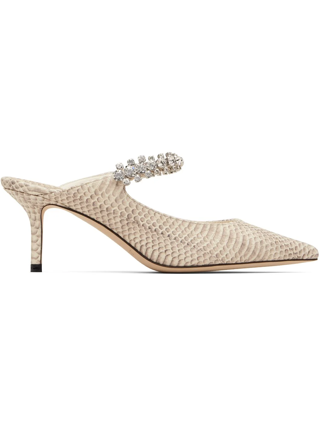 Snake-embossed goatskin heels. · Pointed toe · Crystal-cut accents at fixed strap · Logo patch at grained leather footbed · Covered stiletto heel · Calfskin nubuck sole · Heel: H2.5" Supplier color: Roccia Upper: goatskin. Sole: calfskin. Made in Italy 252528F122019