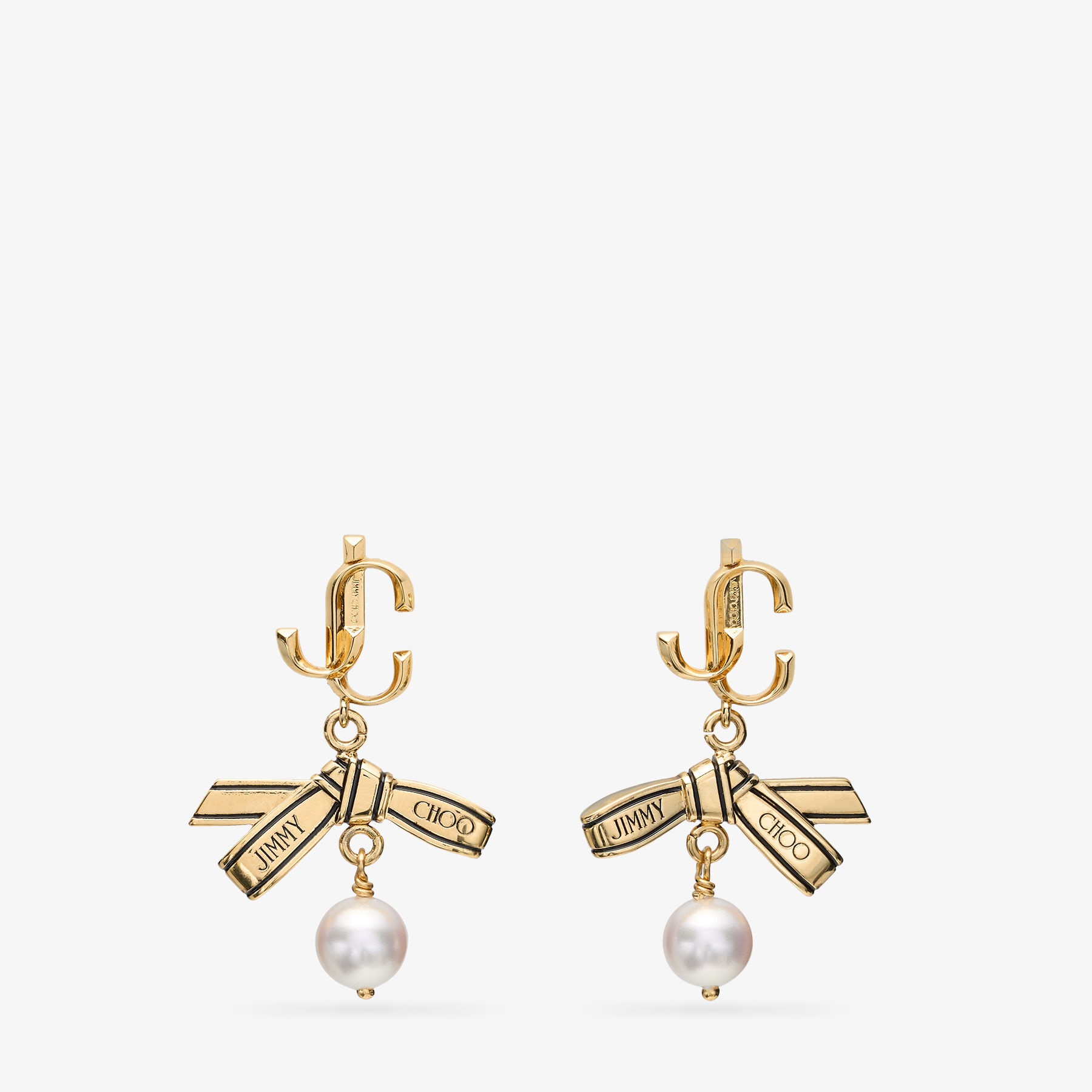 Details, Care & Fit A playful nod to house codes, these gold-tone earrings feature sculptural metal ribbon charms engraved with the jimmy choo logo. Suspended below, a luminous pearl drop is finished with a miniature JC emblem – bringing soft shine and signature detailing to every turn. A refined statement with a hint of charm. - Gold finish metal - Metal ribbon - Resin pearl charm - JC emblem - For pierced ears - Butterfly back - Presented in Jimmy choo pouch and box - Due to its handcrafted nature, every style is unique and there may be small differences between the pieces - Made in Italy - Please note that this product is not eligible for return