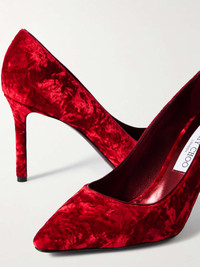 EDITORS'NOTES Jimmy Choo's crushed velvet 'Romy' pumps make a chic addition to any outfit. Utterly classic, they're set on an 85mm heel and padded insole, giving you the perfect amount of lift. Small to size. See Size & Fit notes. SIZE & FIT - Fits small to size, take a half size larger than normal - Italian sizing DETAILS & CARE - Heel measures approximately 85mm/ 3.5 inches - Tonal-red velvet - Slip on - Designer color: Ruby Red