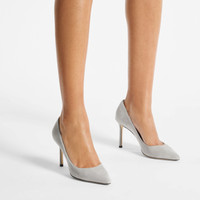Details, Care & Fit Defined by a sleek and angular aesthetic, the Romy is a signature pointed pump. The tonal dove-coloured suede complements a classic silhouette, set on a slim 85mm stiletto heel. - Tonal suede - Soft pointed last construction - Pointed toe - Leather sole and lining - Heel height measures: 85mm/3.3 inches - Made in Italy