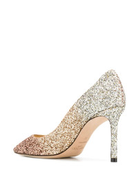 85mm Romy pumps Jimmy Choo are here to meet all your Sex and The City desires. Crafted from gold-tone leather, these Romy 85mm pumps are covered in ombre glitter for a dazzling finish. 'I lost my Choo!'. Featuring a pointed toe, a leather insole, a high stiletto heel and glitter details. Made in Italy Composition Sole: Calf Leather 100% Lining: Goat Skin 100% Outer: PVC 95%, Lamb Skin 5% SIZE & FIT Measurement HEEL 3.54 in(9 cm)