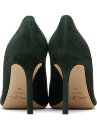 Goatskin suede heels. · Pointed toe · Grained leather lining · Covered stiletto heel with rubber injection · Calfskin nubuck sole · Heel: H3.75" Supplier color: British Green Upper: goatskin. Sole: calfskin, rubber. Made in Italy 261528F122071