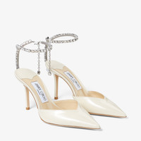 Details, Care & Fit Blurring the lines between shoes and jewellery, the SAEDA pumps in linen patent leather are instantly recognisable as Jimmy Choo. Made in Italy, a delicate crystal chain suspends a single crystal and gently adorns the ankle like jewellery, while the meticulously crafted crystals also drip gracefully down the line of the heel. Striking and statement, this pointed pair is set on a slim 85mm heel. A sparkling statement style. - Patent leather - Crystal chain embellishment - Pointed toe - Slim heel - Heel height measures: 85mm/3.3 inches - Made in Italy