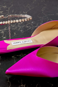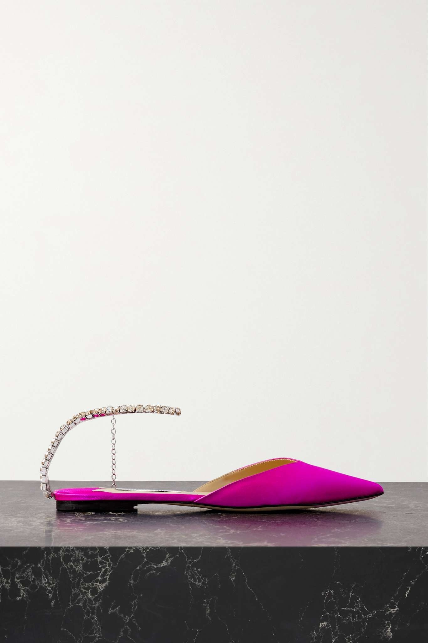 EDITORS'NOTES Jimmy Choo often incorporates jewelry-inspired details in its designs - these 'Saeda' flats are adorned with crystal-encrusted straps with charms that trail down the ankle. They're made from fuchsia satin and have an elegant pointed toe with a vamp to match. SIZE & FIT - Fits small to size, take a half size larger than normal - Italian sizing DETAILS & CARE - Slight heel - Fuchsia satin - Hook-fastening ankle strap