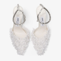 Details, Care & Fit Blurring the line between footwear and jewellery, the iconic Saeda pump in ivory mesh is embellished entirely in delicate petals with light-catching crystal detail. It is made distinct with a delicate crystal anklet. This shining statement features a drop crystal that hangs elegantly at the back of the shoe. The anklet is designed and crafted to sit low on the ankle, effortlessly elongating the leg. Striking and glamorous, this pair is set on a 100mm stiletto heel. - Mesh - Crystal chain - Crystal embellishment - Petal embroidery - Pointed toe - Stiletto heel - Heel height Measures: 100mm / 3.9 inches - Made in Italy - This product was made using leather from tanneries receiving Leather Working Group Gold or Silver-Certification in recognition of their environmental performance